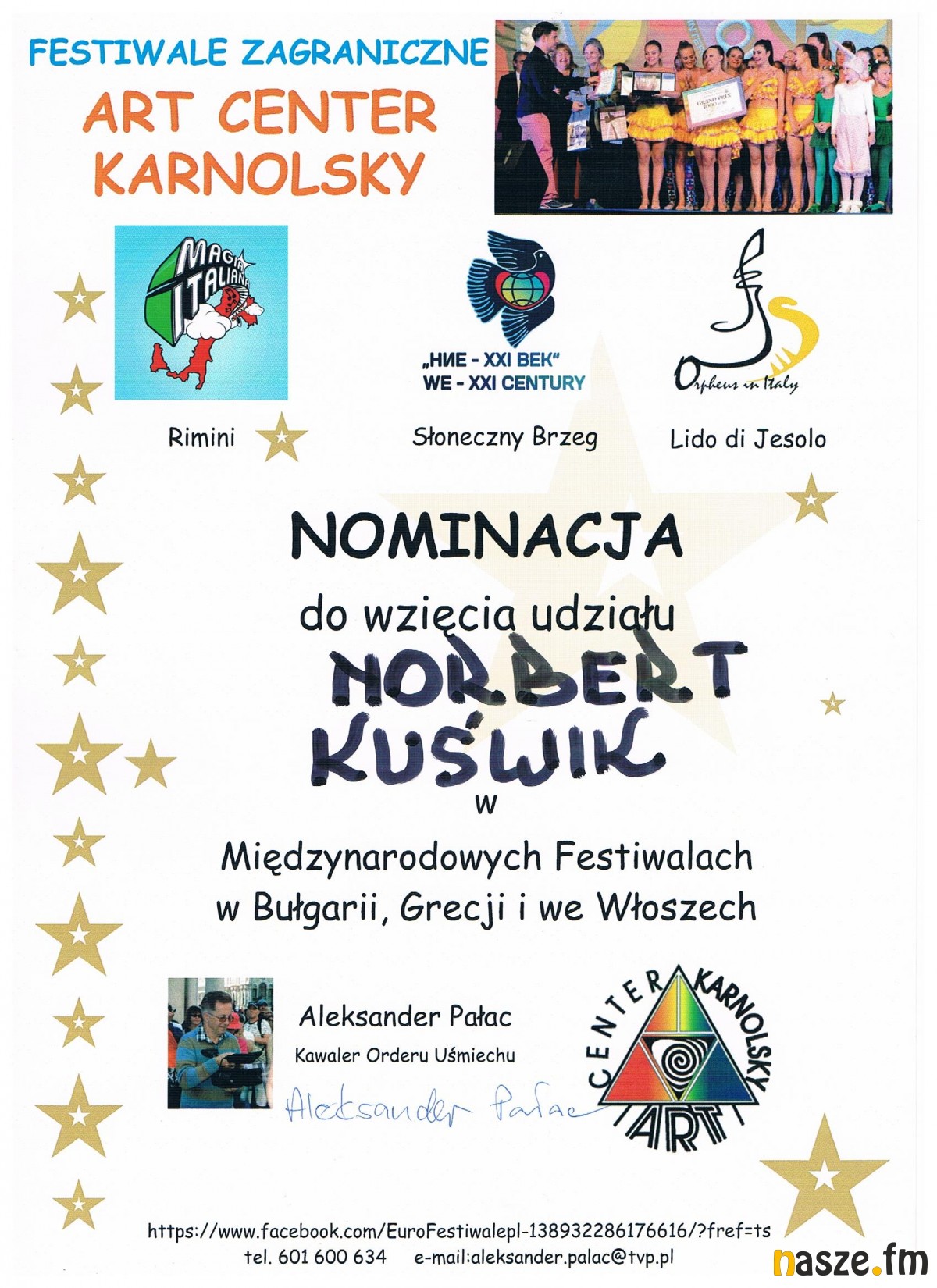 Jurorów zachwycił 16 letni wykonawca z Powiatowego Młodzieżowego Domu Kultury "Na pięterku" w Zduńskiej Woli – Norbert Kuświk. Ujął jurorów interpretacją piosenki "New York" z repertuaru Franka Sinatry za którą dostał II miejsce. Otrzymał również nominację do wzięcia udziału w Międzynarodowych Festiwalach "Słoneczny brzeg" w Bułgarii, "Rimini" we Włoszech i "Lido di Jesolo" w Grecji. Należy nadmienić, że jest to już druga po festiwalu w Pradze, międzynarodowa nagroda wychowanka instruktora Tomasza Marciniaka z PCKSR w ciągu ostatnich trzech miesięcy.