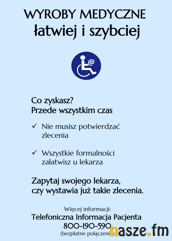 1 stycznia 2020 r. wchodzą w życie nowe zasady wystawiania, weryfikacji i realizacji zleceń na zaopatrzenie w wyroby medyczne. Rozwiązanie to poprawi dostępność do wyrobów medycznych dla pacjentów niepełnosprawnych i mieszkających w niedużych ośrodkach z dala od oddziałów wojewódzkich Funduszu.