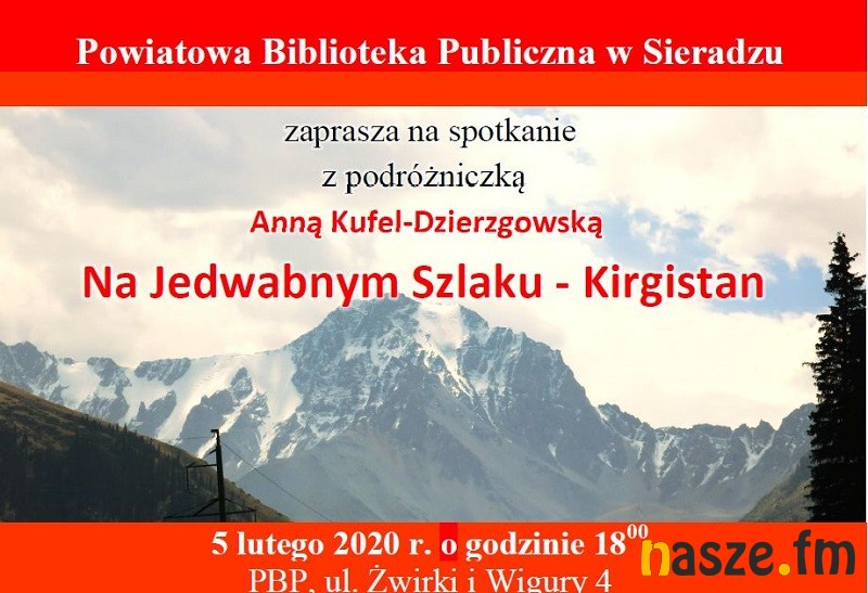 Powiatowa Biblioteka Publiczna w Sieradzu zaprasza na spotkanie z podróżniczką, Anną Kufel-Dzierzgowską - "Na Jedwabnym Szlaku - Kirgistan". Dlaczego warto wybrać się do tego kraju i jakie miejsca wybrać? Odpowiedzi na te, jak i więcej pytań, usłyszycie podczas prelekcji. Spotkanie odbędzie się w środę 5 lutego o godz. 18:00 w PBP Sieradz, ul. Żwirki i Wigury 4, wstęp wolny.