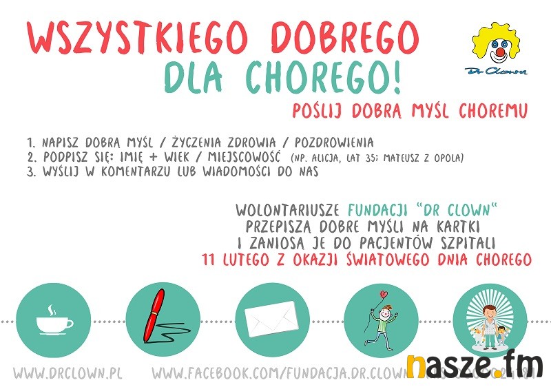 - W szpitalach i hospicjach chorzy na co dzień otoczeni są troską swoich najbliższych i personelu. Światowy Dzień Chorego, który przypada 11 lutego, jest okazją, byśmy pomyśleli o nich wszyscy. Fundacja „Dr Clown" zachęca: podaruj dobrą myśl choremu – życzenia, słowa otuchy i wsparcia – a wolontariusze przekażą je chorym w szpitalach i hospicjach. Akcja „Wszystkiego dobrego dla chorego" odbywa się w ponad 25 miastach, w tym także w Sieradzu.- dodaje Katarzyna Kwapiszewska