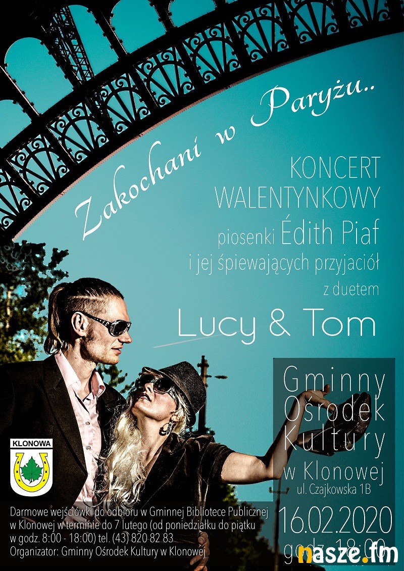 Gminny Ośrodek Kultury w Klonowej zaprasza 16 lutego na koncert walentynkowy duetu Lucy & Tom. Koncertowi towarzyszyć będzie wystawa fotografii "Paris, Paris.." codziennego - niecodziennego Miasta Świateł widzianego oczami autorki - Lucy, paryżanki z wyboru i z serca.