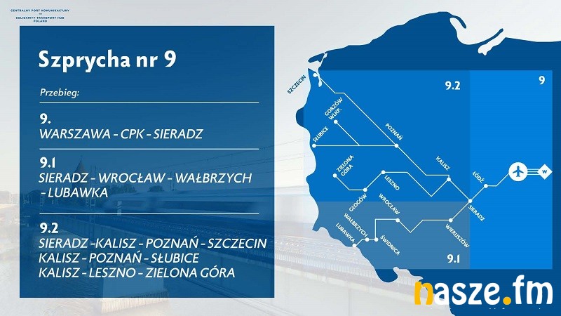 SSL zakłada, że Sieradz w tworzonym układzie komunikacyjnym będzie odgrywał ważną rolę. Program kolejowy CPK zakłada, że biegnąca od CPK i Warszawy kolejowa szprycha 9 poprowadzi pociągi z prędkością 250 km/h przez Łódź Fabryczną do zachodnich województw Polski.