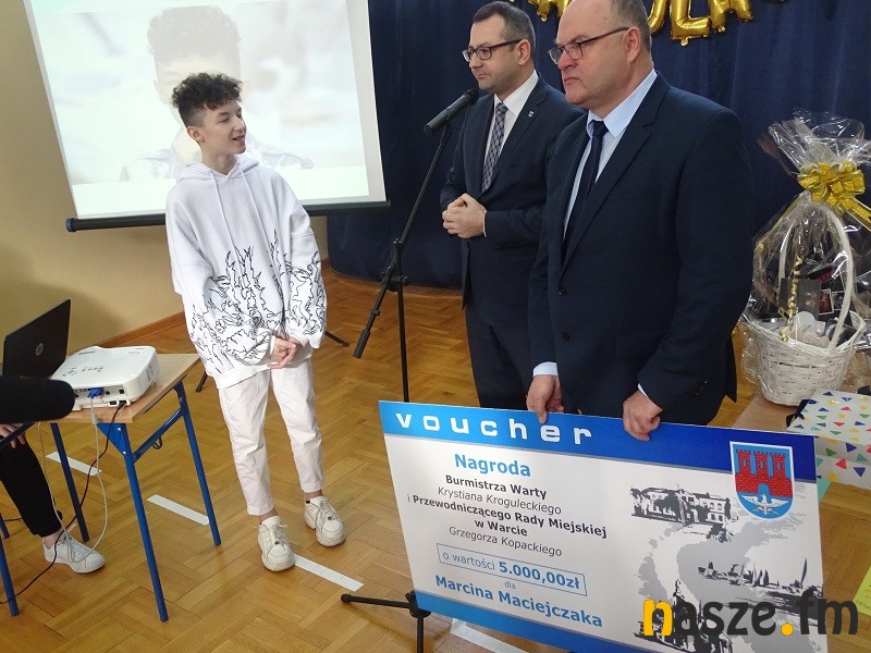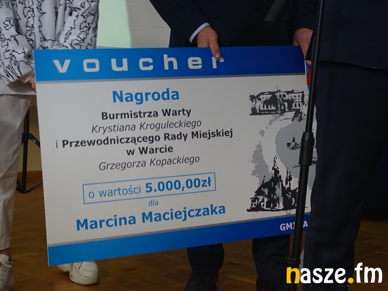 Na dzisiejszym spotkaniu z Marcinem pojawili się m.in. Krystian Krogulecki, Burmistrz Warty oraz Grzegorz Kopacki, Przewodniczący Rady Gminy w Warcie, którzy wręczyli Marcinowi nagrodę wartości 5 tysięcy złotych.
