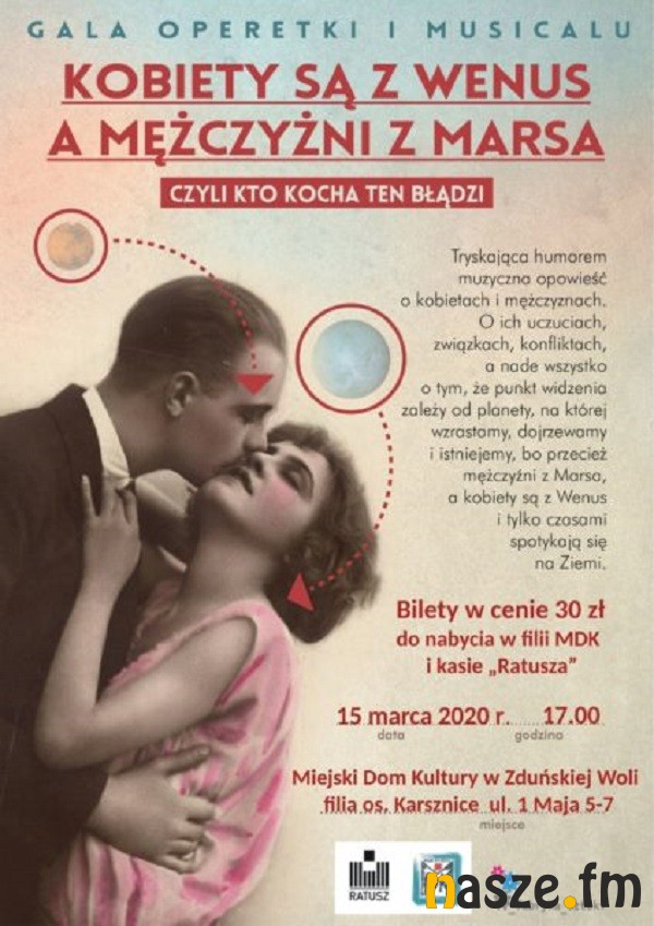 Filia Miejskiego Domu Kultury w Karsznicach zaprasza na Koncert Musicalowo-Operetkowy "Kobiety są z Wenus, a mężczyźni z Marsa". To 15 marca w siedzibie placówki.
