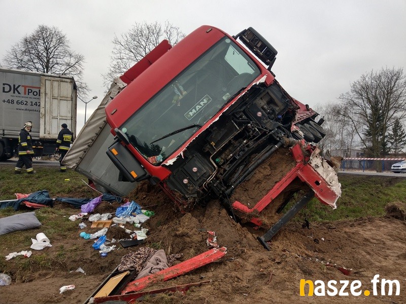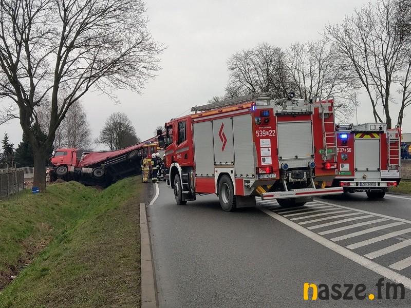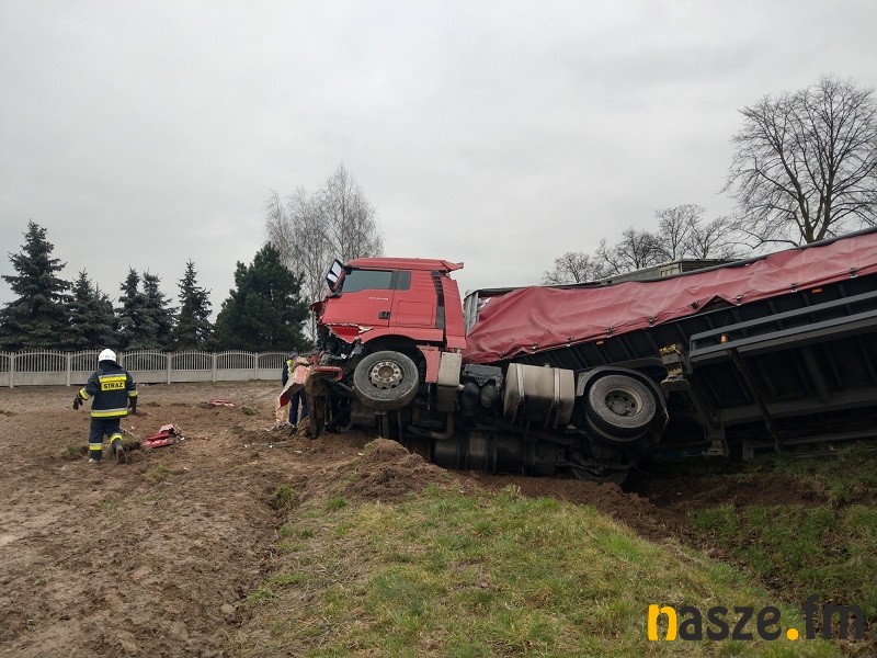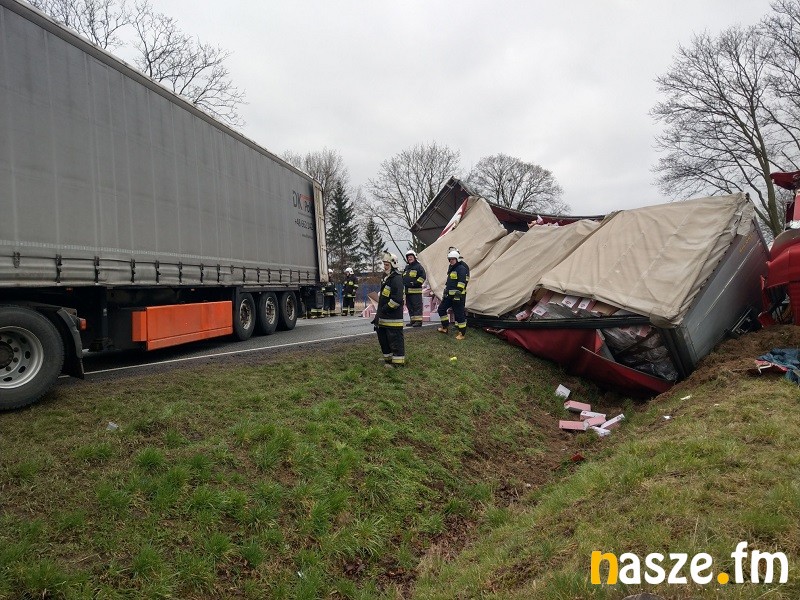 Samochód przewoził artykułu spożywcze. Służby musiały przeprowadzić przeładunek towaru, ponieważ naczepa została uszkodzona, a ten znalazł się w rowie i na drodze. Samochód musiał też zostać wyciągnięty z rowu.