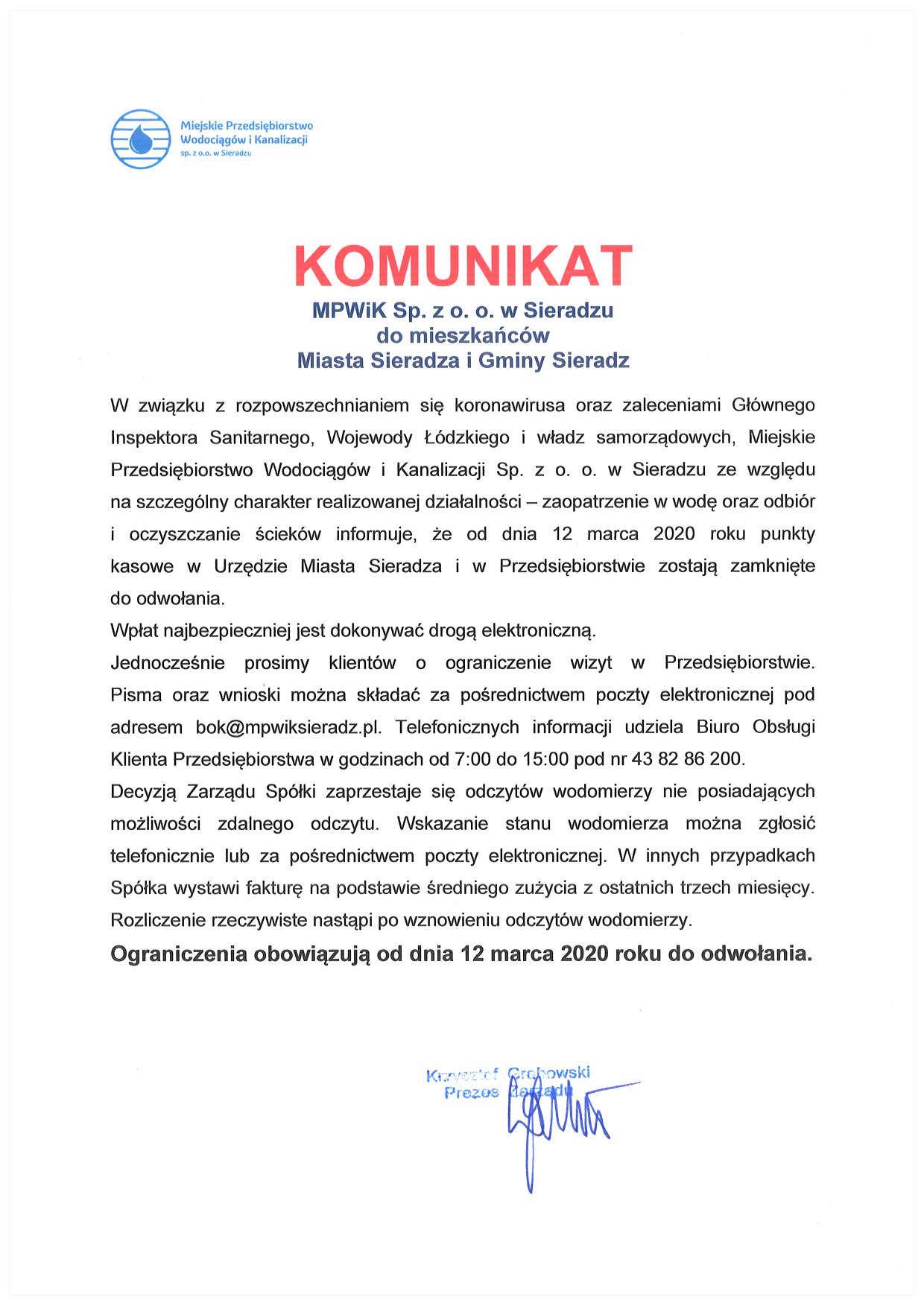 PK prosi o ograniczenie wizyt w Przedsiębiorstwie Komunalnym Spółka z o. o. w Sieradzu przy ul. Wojska Polskiego 102 i przy ul. Kosynierów 1.
