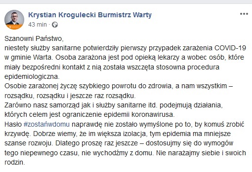 niestety służby sanitarne potwierdziły pierwszy przypadek zarażenia COVID-19 w gminie Warta. Osoba zarażona jest pod opieką lekarzy a wobec osób, które miały bezpośredni kontakt z nią została wszczęta stosowna procedura epidemiologiczna.Osobie zarażonej życzę szybkiego powrotu do zdrowia, a nam wszystkim – rozsądku, rozsądku i jeszcze raz rozsądku. Zarówno nasz samorząd jak i służby sanitarne itd. podejmują działania, których celem jest ograniczenie epidemii koronawirusa. Hasło #zostańwdomu naprawdę nie zostało wymyślone po to, by komuś zrobić krzywdę. Dobrze wiemy, że im większa izolacja, tym epidemia ma mniejsze szanse rozwoju. Dlatego proszę raz jeszcze – dostosujmy się do wymogów tego niepewnego czasu, nie wychodźmy z domu. Nie narażajmy siebie i swoich rodzin - czytamy we wpisie burmistrza Warty w mediach społecznościowych.