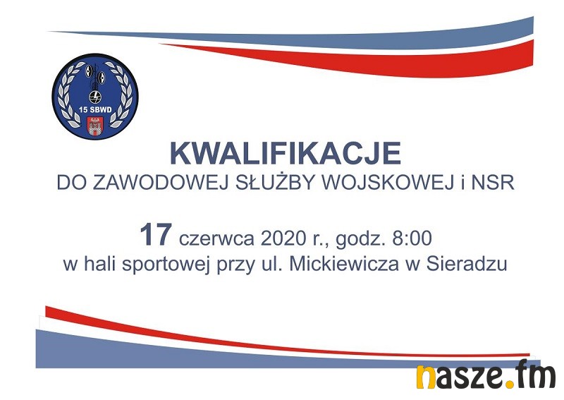 Zachęcamy do udziału w kwalifikacjach organizowanych w 15 Sieradzkiej Brygadzie Wsparcia Dowodzenia do zawodowej służby wojskowej i Narodowych Sił Rezerwowych. Odbędą się one 17 czerwca br. (godz. 8:00 w hali sportowej przy ul. Mickiewicza 15 w Sieradzu).