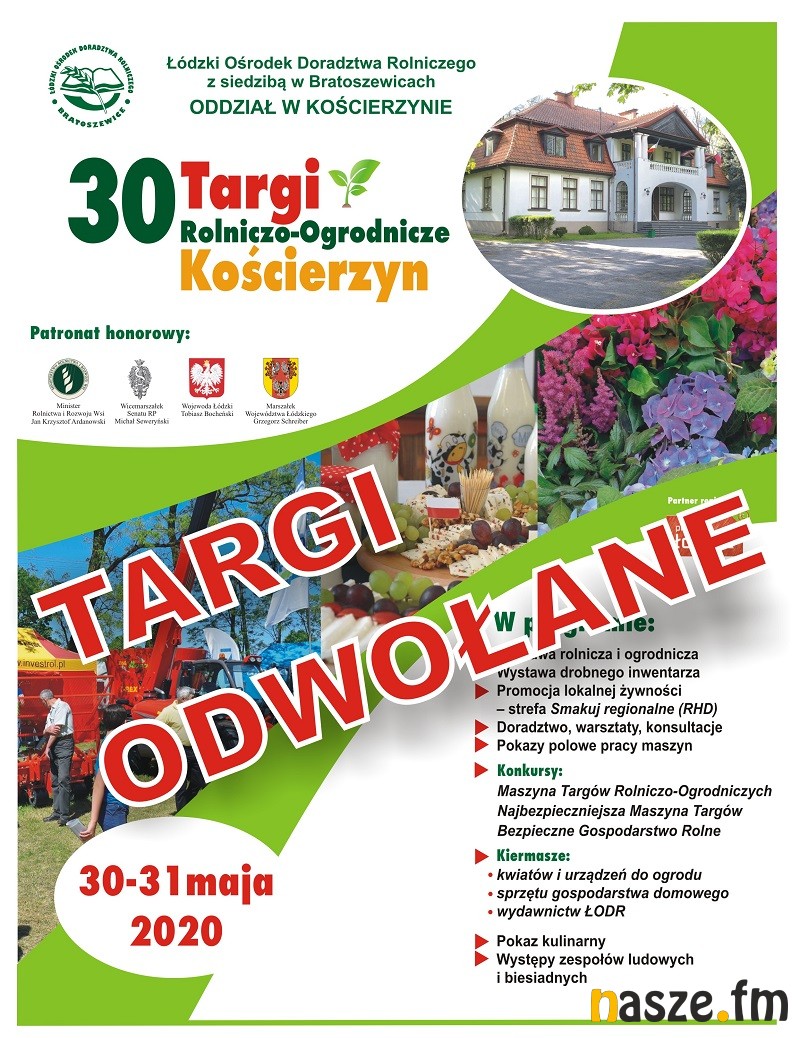 W związku z aktualną sytuacją epidemiologiczną oraz rekomendacjami organów państwowych w zakresie organizowania zgromadzeń, organizatorzy podjęli decyzję o odwołaniu planowanych na 30-31 maja jubileuszowych, 30. Targów Rolniczo-Ogrodniczych w Kościerzynie.