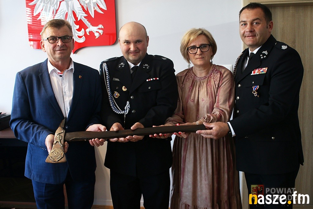 Władze powiatowe zaprosiły bohaterskiego druha do sieradzkiego starostwa, by w symboliczny sposób podziękować mu za postawę. Wicestarosta Kazimiera Gotkowicz, członek Zarządu Powiatu Sieradzkiego Tomasz Baliński oraz radny powiatowy Michał Ławniczak - prezes OSP w Brąszewicach, wręczyli Łukaszowi Dąbkowi pamiątkowy topór strażacki wraz z pisemnym podziękowaniem od starosty Mariusza Bądziora.