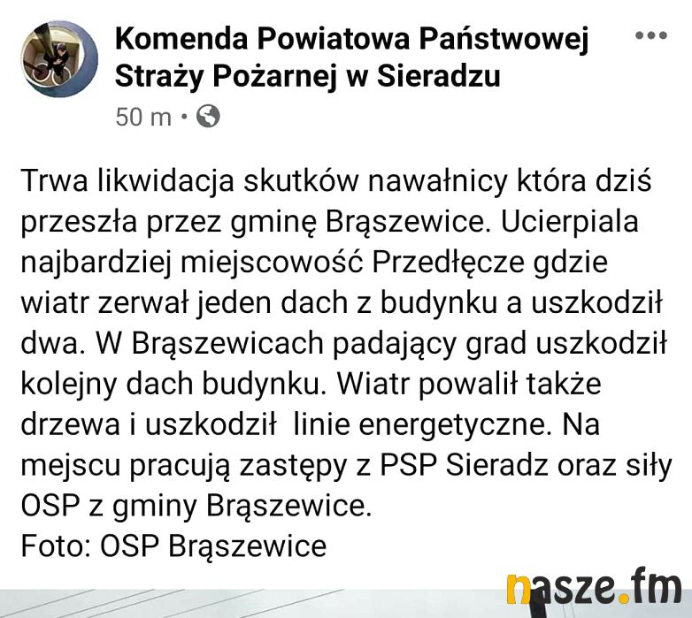 - Uszkodzone są dachy trzech budynków mieszkalnych w miejscowości Przedłęcze i cztery lub pięć dachów budynków mieszkalnych w miejscowości Brąszewice. To z powodu gradobicia i porywistych wiatrów - informuje ogniomistrz Krzysztof Biernacki z PSP w Sieradzu.