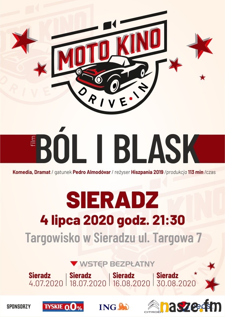 Jutro na targowisku w Sieradzu przy ul. Targowej odbędzie się pierwszy tego lata seans filmowy w ramach kina samochodowego. Będzie można obejrzeć hiszpański dramat "Ból i blask". Początek seansu o 21:30, wstęp bezpłatny. Więcej szczegółów znajdziecie poniżej.