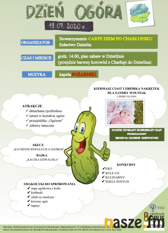 Stowarzyszenie Carpe Diem Po Charłupsku zaprasza 19 lipca na "Dzień ogóra". Festyn odbędzie się o godz. 14 na placu zabaw w Dzierlinie. Dochód ze sprzedaży ciast będzie przeznaczony na leczenie Sandry Wolniak, chorej na SMA.