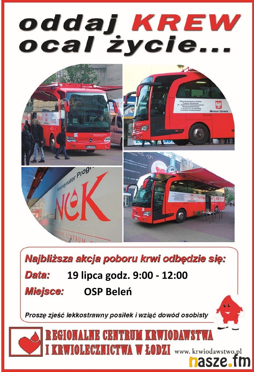 Strażacy z OSP Beleń zapraszają honorowych dawców na zbiórkę krwi. Akcja odbędzie się w najbliższą niedzielę - 19 lipca - przy strażnicy OSP w Beleniu (gm. Zapolice).