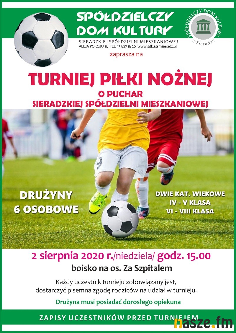 Spółdzielczy Dom Kultury w Sieradzu zaprasza 2 sierpnia na Turniej Piłki Nożnej o Puchar Sieradzkiej Spółdzielni Mieszkaniowej. Początek o godz. 15 na boisku na osiedlu za Szpitalem.