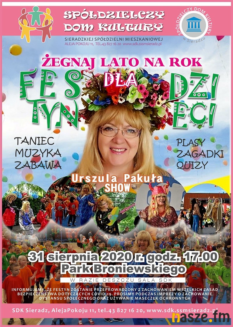 W programie m.in. Urszula Pakuła Show. Będzie też wiele atrakcji dla najmłodszych. Festyn odbędzie się dzisiaj od godz. 17 w parku Broniewskiego w Sieradzu. Wstęp wolny z zachowaniem zasad reżimu sanitarnego.Szczegóły na plakacie.