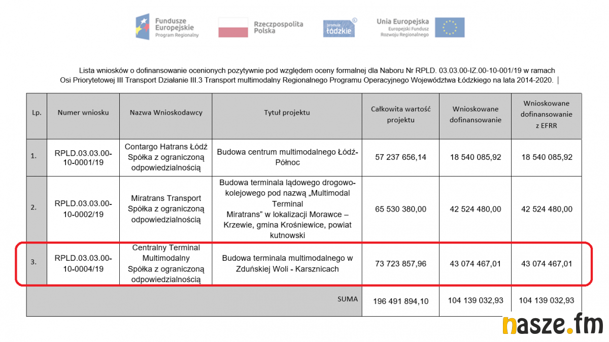 Projekt przygotowany przez spółkę w oparciu o materiały przekazane przez samorządy opiewa na blisko 74 mln. zł, w tym ponad 43 mln. zł. stanowiłoby dofinansowanie w ramach RPO Województwa Łódzkiego.