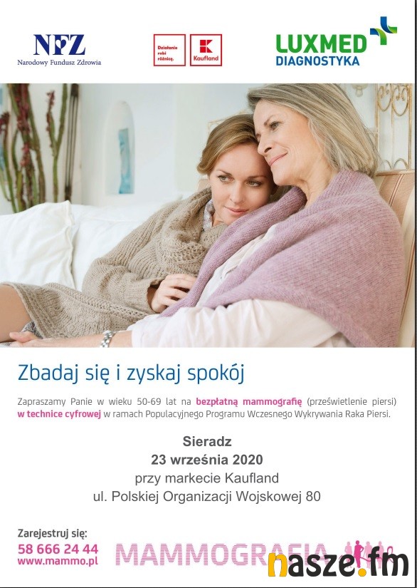 23 września przy markecie Kaufland w Sieradzu będzie można wykonać badania mammograficzne. Skierowane są dla kobiet w wieku 50-69 lat. Wykonywane są w ramach Programu Profilaktyki Raka Piersi finansowanego przez NFZ i nie wymagają skierowania lekarskiego.