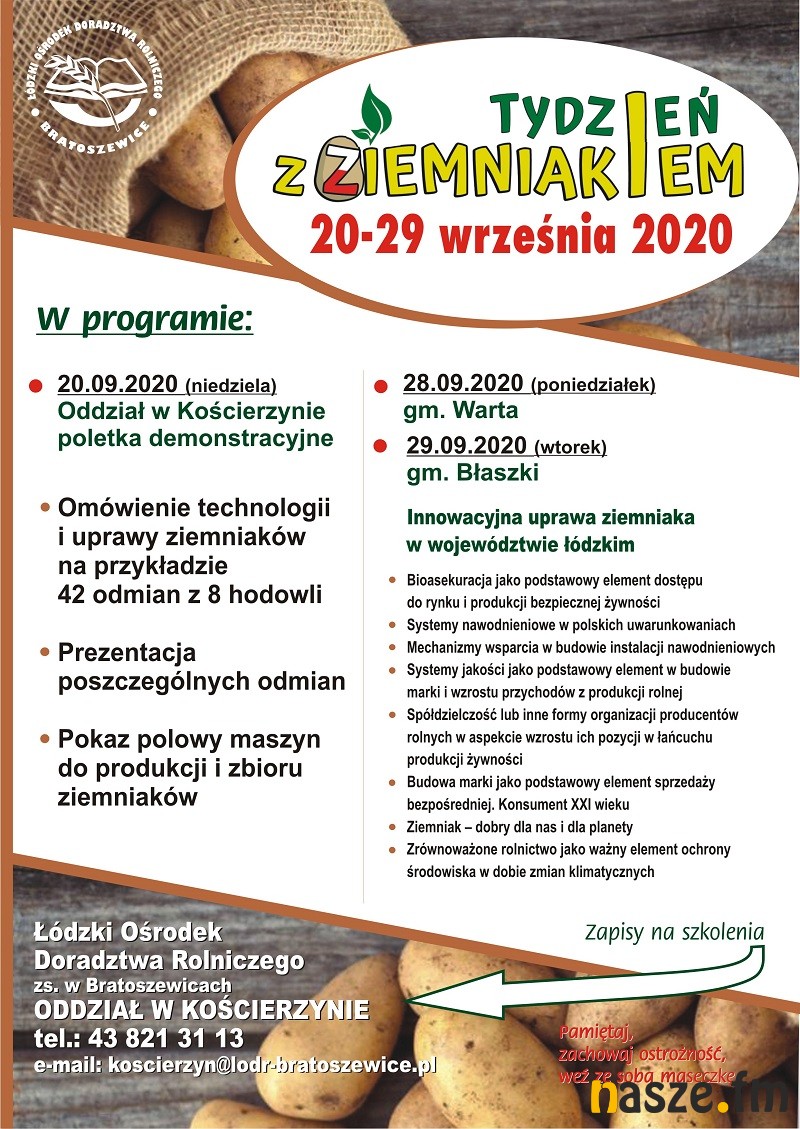 Ziemia sieradzko-wieluńska słynie z uprawy smacznego i zdrowego ziemniaka, dlatego też wychodząc naprzeciw zapotrzebowaniu, Łódzki Ośrodek Doradztwa Rolniczego z siedzibą w Bratoszewicach Oddział w Kościerzynie w dniach 20-29 września br. organizuje wydarzenie pod nazwą "Tydzień z ziemniakiem”.