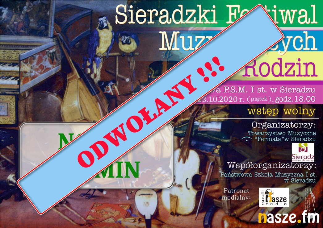 Organizatorzy Sieradzkiego Festiwalu Muzykujących Rodzin - Towarzystwo Muzyczne FERMATA i Państwowa Szkoła Muzyczna I st. w Sieradzu - z przykrością informują, iż zostali zmuszeni do odwołania tegorocznej edycji festiwalu.