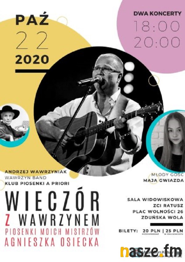 Wystąpią: Andrzej Wawrzyniak, Wawrzyn Band, Klub Piosenki A Priori, młodym gościem wieczoru będzie Maja Gwiazda.