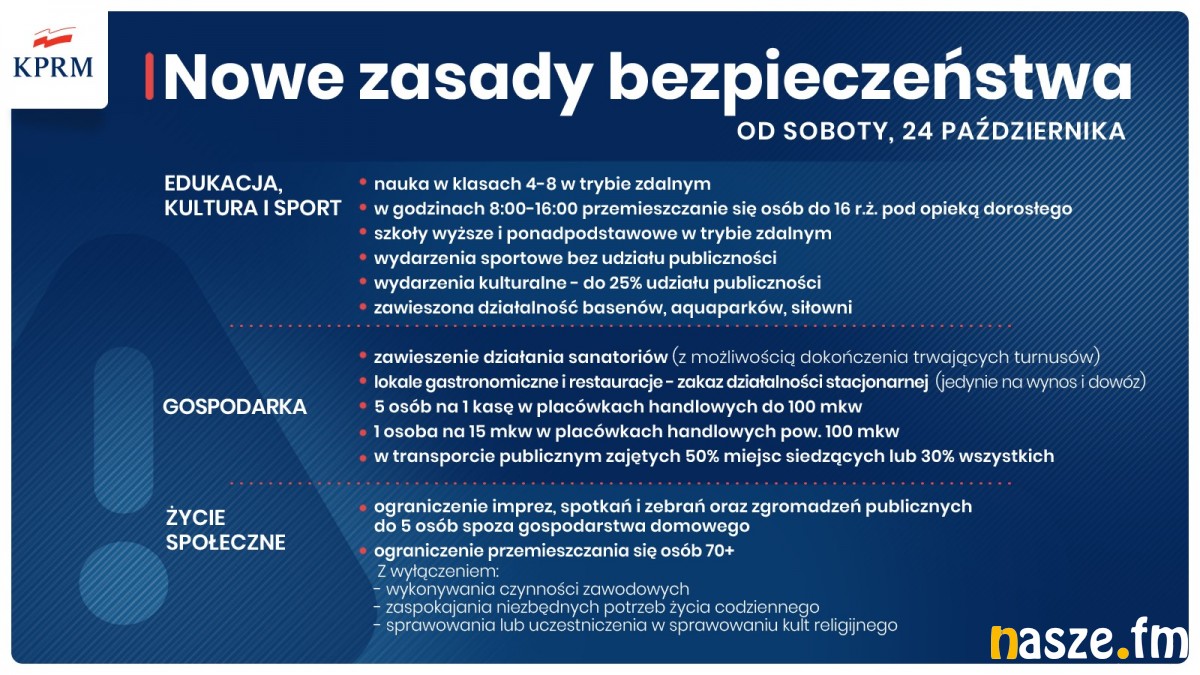 Od 24 października obostrzenia dotyczące strefy czerwonej będą obowiązywać w całej Polsce. Dodatkowo wprowadzamy nowe zasady bezpieczeństwa w zakresie edukacji, gospodarki oraz życia społecznego. Będą to: