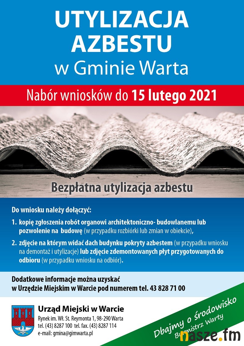 Dotyczy to transportu i utylizacji odpadów zawierających azbest. Chodzi o materiały pochodzące z wymiany pokrycia dachowego domu mieszkalnego oraz budynku gospodarczego. Więcej szczegółów w warckim magistracie.