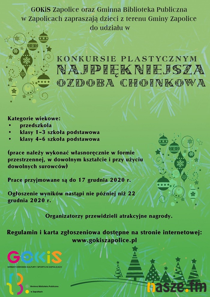 GOKiS Zapolice i Gminna Biblioteka Publiczna w Zapolicach zapraszają dzieci z terenu Gminy Zapolice do udziału w konkursie plastycznym na najpiękniejszą ozdobę choinkową.