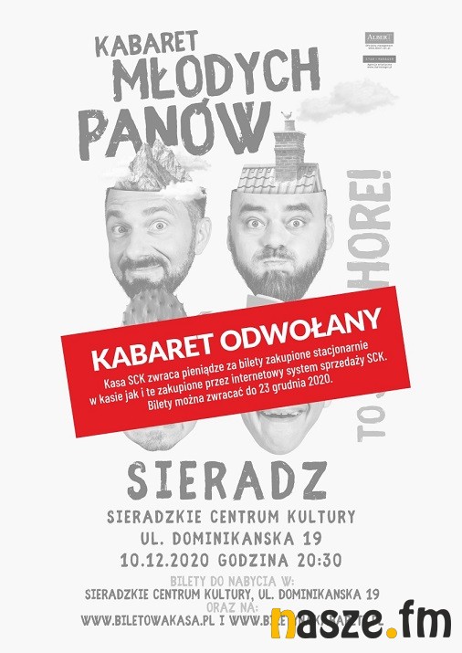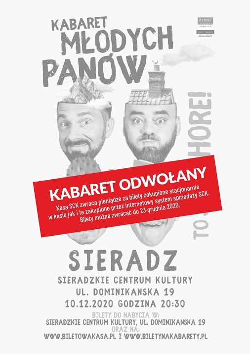 Kasa SCK zwraca pieniądze za bilety zakupione stacjonarnie w kasie jak i te zakupione przez internetowy system sprzedaży SCK. Na występ Kabaretu Paranienormalni bilety można oddawać do 18 grudnia, jeśli chodzi o Kabaret Młodych Panów do 23 grudnia.