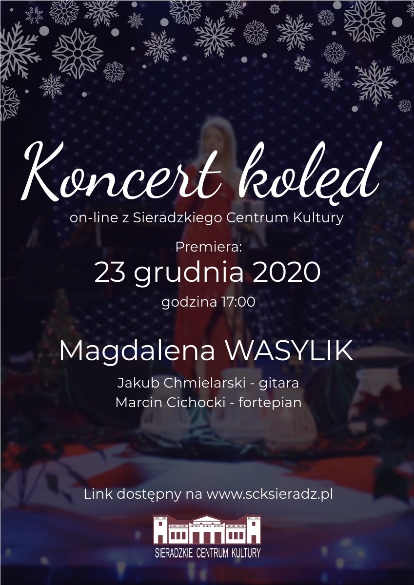 - Drodzy Przyjaciele Sieradzkiego Centrum Kultury! Za nami wyjątkowo trudny pod każdym względem rok. Trudny szczególnie dla kultury. Bardzo dziękujemy, że byliście z nami. Dziękujemy za wszystkie spotkania na wydarzeniach organizowanych w naszych murach, jak i tych plenerowych oraz online. Wasza obecność i dobre słowo daje nam motywację do dalszego działania. Z okazji zbliżających się Świąt, życzymy Wam, aby wszystkie chwile spędzone w rodzinnym gronie były radosne i spokojne. Życzymy również zdrowia i tego, aby nowy rok pozwolił zrealizować wszystkie plany prywatne i zawodowe. Niech 2021 przyniesie wiele okazji do wspólnych spotkań, uśmiechu i smakowania kultury. Życząc wszystkiego, co najpiękniejsze w te Święta, przekazujemy wam link do wyjątkowego koncertu kolęd, który w grudniu tego roku nagraliśmy na deskach naszej sceny. Najpiękniejsze pieśni Bożonarodzeniowe zaśpiewała dla Państwa utalentowana sieradzanka, Magda Wasylik. Mamy ogromną nadzieję, że ten koncert pomoże wprowadzić magiczny klimat Świąt w tych trudnych i wyjątkowych czasach. Życzymy przyjemnego słuchania - pracownicy Sieradzkiego Centrum Kultury.