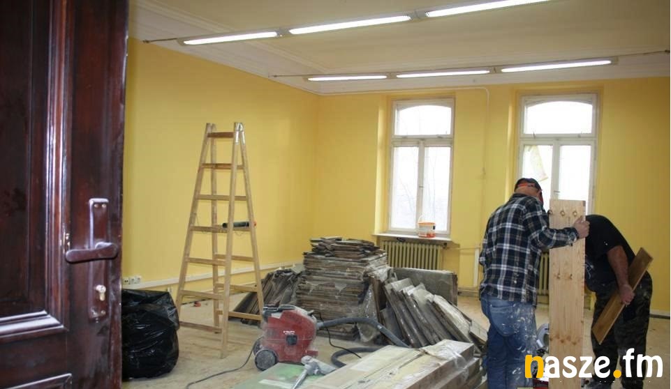 Remont stropów, wymiana podłóg, sufitów, malowanie, docieplanie budynku - to prace, które dobiegają końca w pomieszczeniach znajdujących się w części pałacowej. Remont trwa tutaj od pół roku. Pałac wymaga dalszych renowacji i są szanse na ich kontynuację, złożono stosowny wniosek o środki na dalszy ciąg prac.