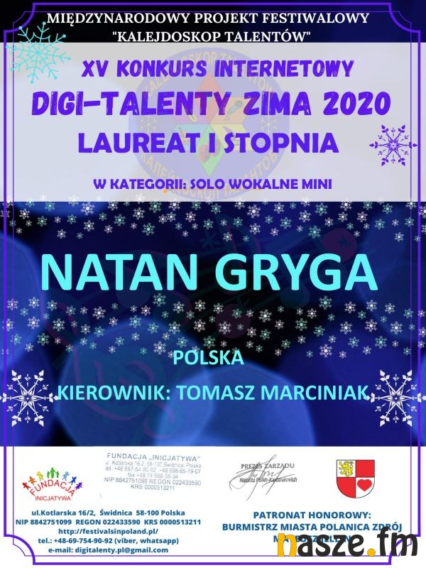 Dodatkowo młodszy Natan Gryga brał również udział w XV Międzynarodowym Konkursie DIGI – TALENTY ZIMA 2020 organizowanym online przez Fundację Inicjatyw w Świdnicy w którym zajął I miejsce za wykonanie pastorałki "Maleńka miłość".