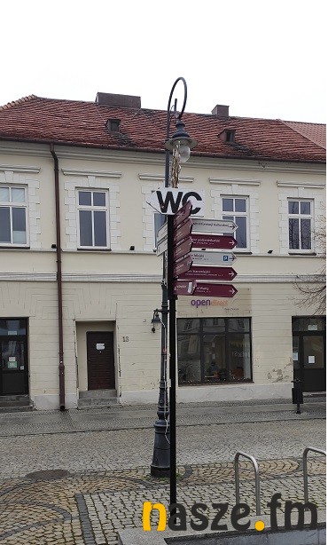 Plakat zawierał treść "WC Pracownicy roku 2020" oraz dwie strzałki skierowane w dół tegoż plakatu.