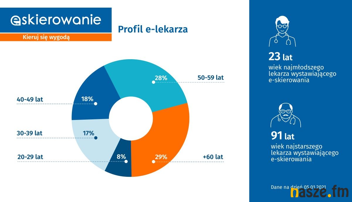 - Najczęściej było wystawiane do poradni okulistycznej (ponad 463 tys.), chirurgii urazowo-ortopedycznej (ponad 456 tys.) i chirurgii ogólnej (ponad 403 tys.). Najliczniejszą grupą, która skorzystała w 2020 roku z tego rozwiązania były osoby 61+ (prawie co czwarte e-skierowanie).