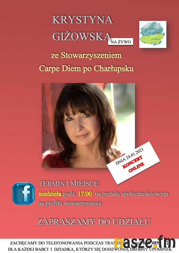 Stowarzyszenie Carpe Diem po Charłupsku zaprasza 24 stycznia na koncert online z okazji Dnia Babci i Dziadka. Ze studia w Charłupi Małej zaśpiewa Krystyna Giżowska, znana z takich przebojów jak " Przeżyłam z tobą tyle lat" czy "Złote obrączki".