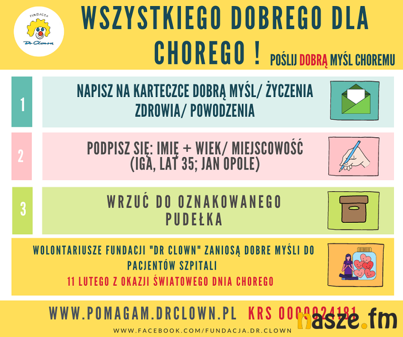Fundacja „Dr Clown” zachęca chętnych do przekazywania dobrych myśli, życzeń, pozdrowień dla chorych. Wolontariusze Fundacji – „doktorzy clowni” dostarczą listy, kartki do chorych przebywających w Szpitalu Wojewódzkim w Sieradzu 11 lutego lub w kolejnych dniach.