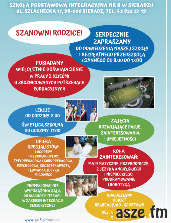 - SPI nr 8 w Sieradzu jest niewielką szkołą, kameralną, przyjazną uczniowi, dynamiczną, stawiającą dziecko w centrum zainteresowania. Jest miejscem dla każdego ucznia- zdolnego oraz tego, który napotyka pewne trudności. Do naszej placówki może uczęszczać każdy uczeń bez względu na miejsce zamieszkania, gdyż nie mamy wskazanego obwodu szkoły. Zaletą naszej szkoły są małe zespoły klasowe. Dzięki temu każdy uczeń ma możliwość indywidualnej pracy z nauczycielem, który rozwija jego pasje, dostrzega ukryte talenty, a przede wszystkim dąży do tego, by dziecko uwierzyło w swoje możliwości, pomimo napotykanych trudności. Uczniowie nasi poznawają świat wszystkimi zmysłami, uczymy poprzez działanie, doświadczenie. Interaktywne narzędzia dydaktyczne takie jak tablice multimedialne, tablety, gry edukacyjne, praca metodą projektu a przede wszystkim indywidualizacja procesu nauczania- informuje Renata Sobczak, dyrektor placówki