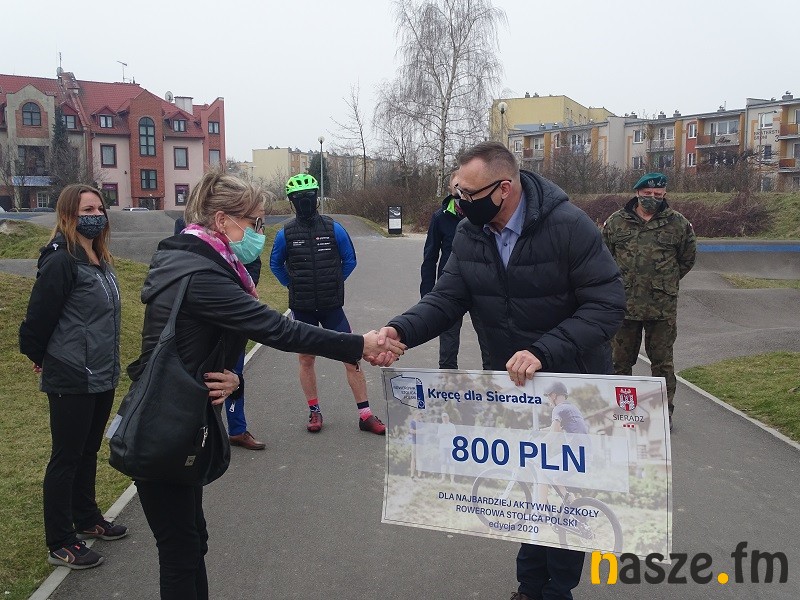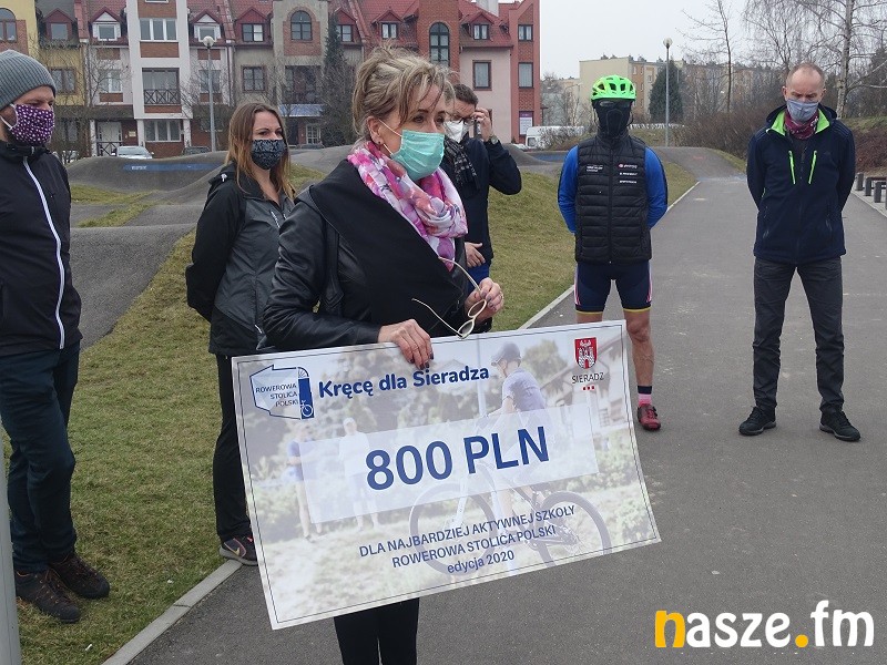 Dzisiejsze spotkanie na terenie pumptracku było też okazją do wręczenia przez prezydenta Sieradza Pawła Osiewałę nagrody za ubiegłoroczny wynik w tej akcji Szkoły Podstawowej nr 10 w Sieradzu. Symboliczny czek na 800 zł odebrała Helena Rajewska, dyrektorka placówki.