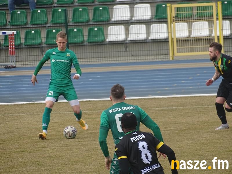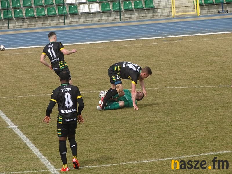 Pierwszą dogodną akcję mieli piłkarze gospodarzy. W 6 minucie Warta ładnie rozegrała pod polem karnym Pogoni, do piłki doszedł Damian Głowacki i oddał strzał nad poprzeczkę. Jeszcze lepszą sytuację miał Adam Patora. Po dośrodkowaniu otrzymał piłkę tuż przed bramkę i uderzył z powietrza. Fantastycznym refleksem popisał się Krzysztof Chruściel i to dzięki swojemu bramkarzowi Pogoń jeszcze nie przegrywała. Zduńskowolanie sami zaczęli utrudniać sobie zadanie. W 27 minucie drugą żółtą kartkę dostał Patryk Retkowski. Warta zaczęła grać w przewadze i natychmiastowo to wykorzystała. Po rzucie rożnym bramkę z główki zdobył Patora. Chwilę później ten sam zawodnik ładnie dograł do Wiktora Płanety, a ten z kilku metrów nie trafił czysto w piłkę. Pod koniec pierwszej połowy kolejną sytuację miał Płaneta. Przegrał jednak z Chruścielem w sytuacji sam na sam.