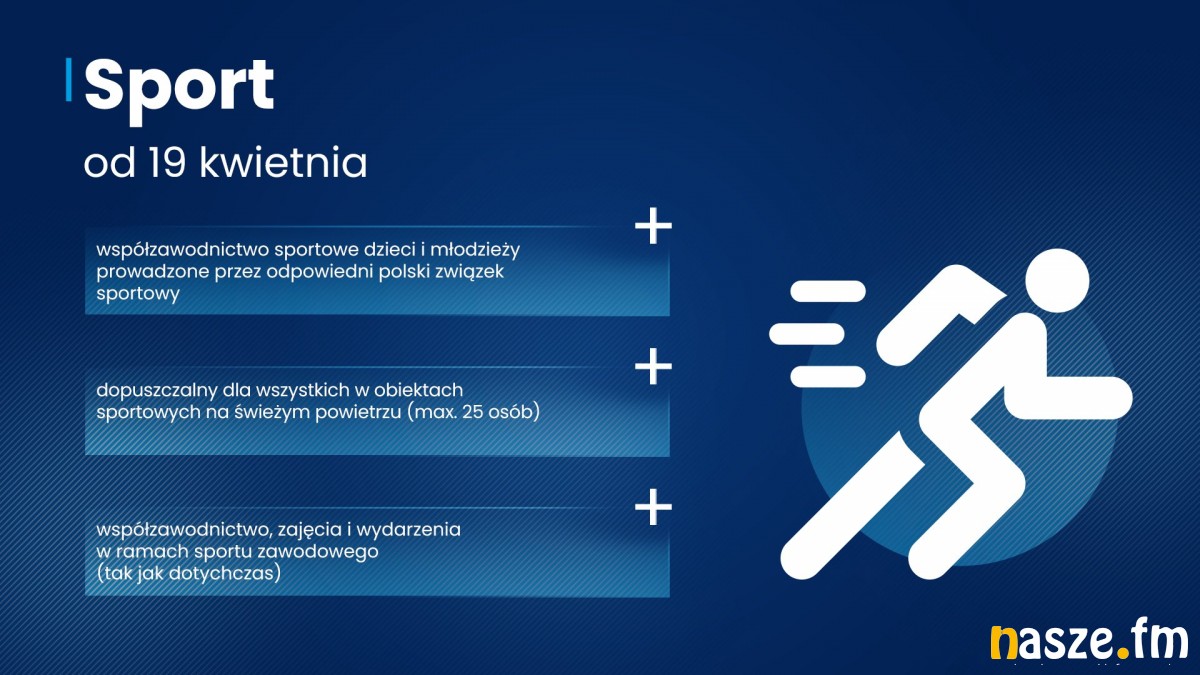 Sport – działalność obiektów sportowych nadal jest ograniczona wyłącznie do sportu zawodowego. Wszelkie wydarzenia mogą się odbywać bez udziału publiczności. Zamknięte pozostają m.in. siłownie, kluby fitness, stoki narciarskie, baseny, sauny i solaria. Od 19 kwietnia dopuszczona jest możliwość uczestnictwa dzieci i młodzieży we współzawodnictwie sportowym prowadzonym przez odpowiedni polski związek sportowy. Rząd zgadza się również na uprawianie sportu w obiektach sportowych na świeżym powietrzu – limit do 25 osób.