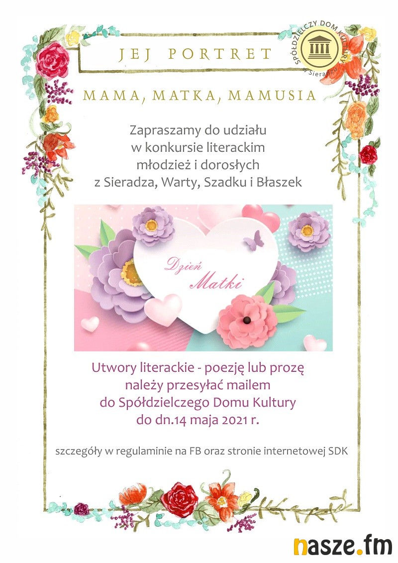 Spółdzielczy Dom Kultury w Sieradzu zaprasza do udziału w konkursie literackim "Jej portret- Mama, Matka, Mamusia". Konkurs skierowany jest do młodzieży i dorosłych terenu miasta Sieradza, Warty, Szadku i Błaszek. Prace należy dostarczyć do 14 maja.