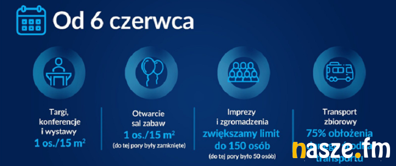 Dzięki zadowalającej sytuacji epidemicznej w Polsce rząd luzuje kolejne obostrzenia. Od 6 czerwca możliwe będzie organizowanie wesel i zgromadzeń do 150 osób, a także targów i konferencji przy zachowaniu limitu - 1 osoba na 15 m2. Otwarte zostaną również sale zabaw dla dzieci. Z transportu publicznego będzie mogło skorzystać więcej pasażerów.