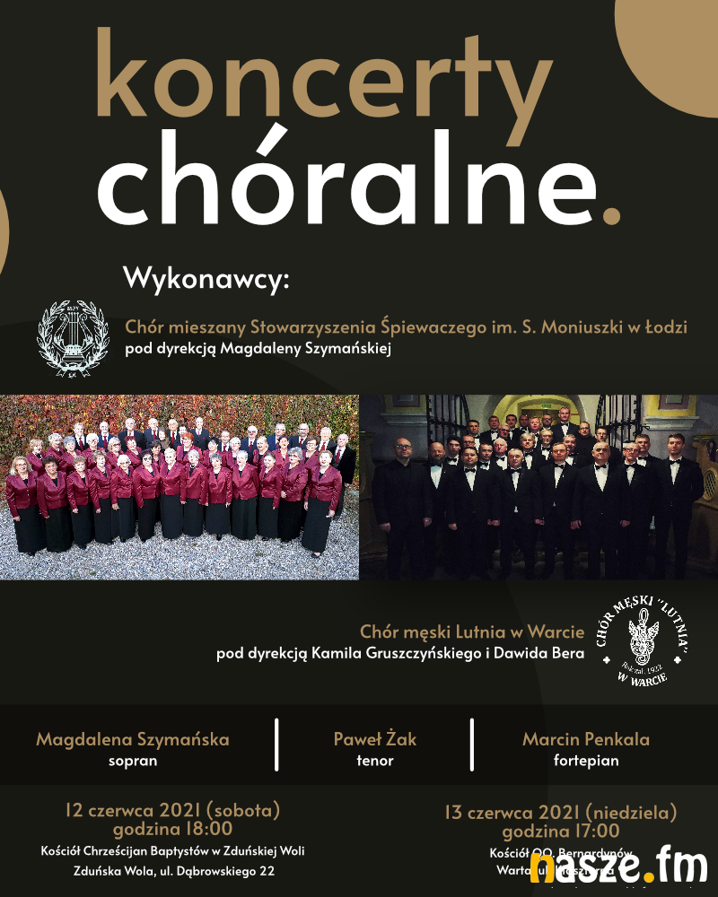 Wystąpią: Chór mieszany Stowarzyszenia Śpiewaczego im. St. Moniuszki w Łodzi pod dyrekcją Magdaleny Szymańskiej i Chór męski Lutnia w Warcie pod dyrekcją Kamila Gruszczyńskiego i Dawida Bera. Zagra pianista Marcin Penkala, usłyszymy tez solistów: Magdalenę Szymańską (sopran) i Pawła Żaka (tenor).
