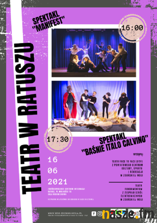 Po dłuższej przerwie Miejski Dom Kultury w Zduńskiej Woli wraca z dwiema teatralnymi propozycjami: "Manifest" - Teatr Face To Face (F2F) z Powiatowego Centrum Kultury, Sportu i Rekreacji w Zduńskiej Woli oraz "Baśnie Italo Calvino" - Teatr Fundamentum z Zespołu Szkół Elektronicznych w Zduńskiej Woli.