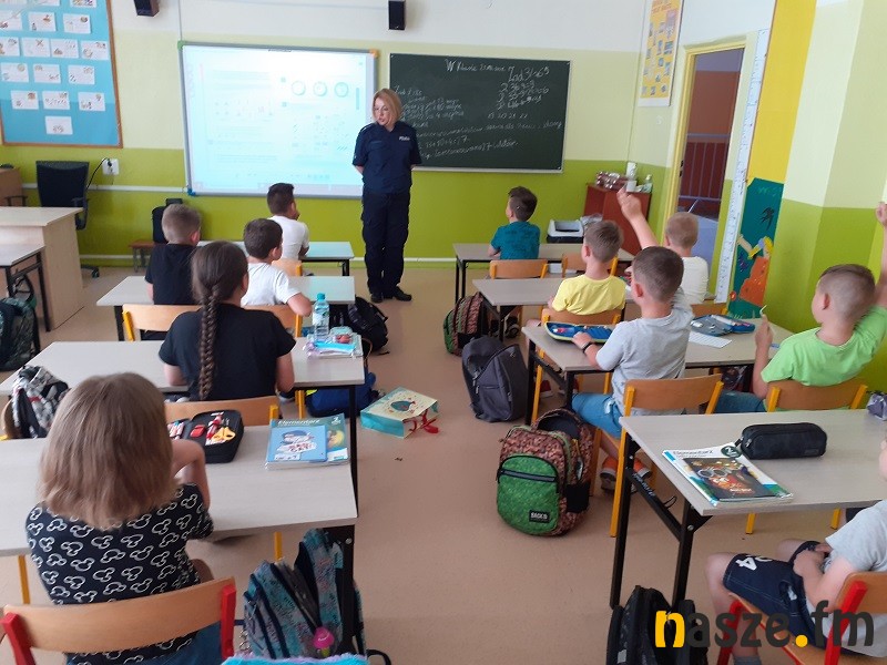 Prelekcja była również bardzo dobrą okazją do sprawdzenia wiedzy na temat numerów alarmowych oraz reakcji w sytuacjach zagrożenia. Uczniowie aktywnie uczestniczyli w zajęciach, wykazując się dużą wiedzą w zakresie zagadnień dotyczących wakacyjnego bezpieczeństwa. Dzieci otrzymały od policjantki ulotki na temat bezpiecznych zachowań.