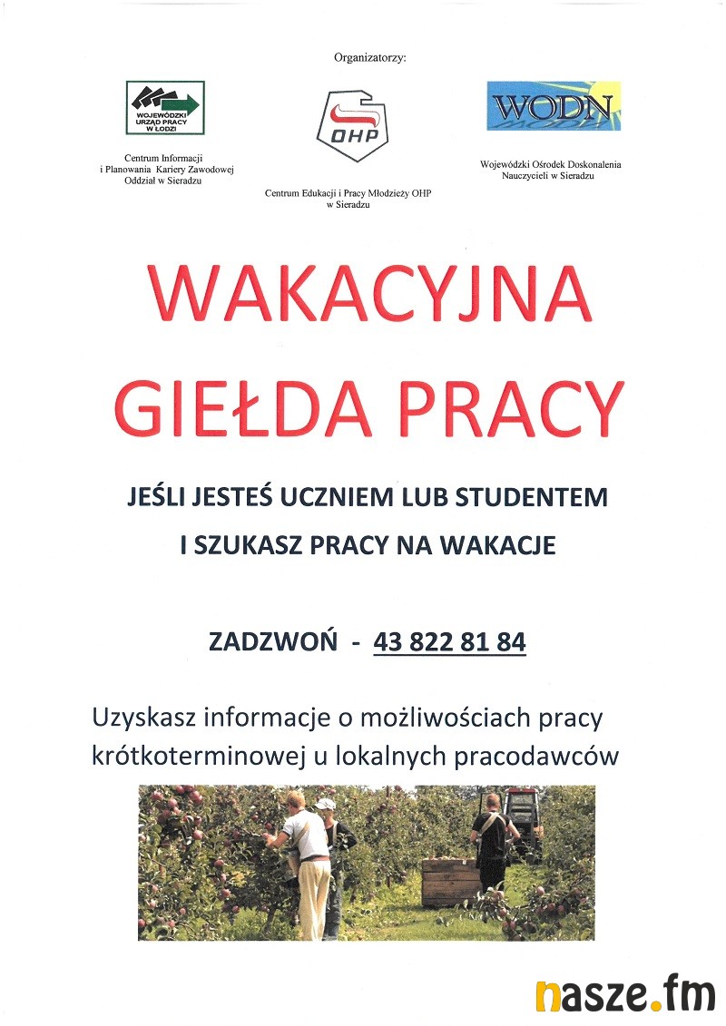 Uczniowie i studenci szukający krótkotrwałego płatnego zajęcia mogą skorzystać z oferty dostępnej telefonicznie. Wakacyjna Giełda Pracy to różne oferty zatrudnienia dla młodych ludzi u lokalnych pracodawców. Zainteresowani powinni kontaktować się pod nr. tel: 43 822 81 84.