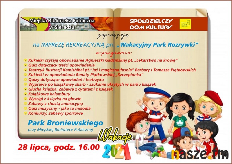Miejska Biblioteka Publiczna i Spółdzielczy Dom Kultury w Sieradzu zapraszają dziś na imprezę pn. „Wakacyjny Park Rozrywki". W programie Quizy konkursy i zabawy związane z opowiadaniami z książek, bajek i teatrzyków. Rywalizacja sportowa indywidualna i zespołowa.