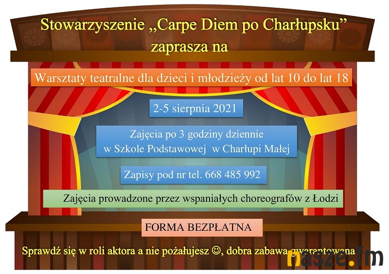 - Wakacyjne warsztaty teatralne dla dzieci i młodzieży w wieku 10-18 lat prowadzone będą przez choreografow z Łodzi. Codziennie będą zgłębiane techniki gry aktorskiej nie tylko przez naukę a także przez zabawę. Jedyne w swoim rodzaju warsztaty są bezpłatne i warto wziąć w nich udział- zaprasza Dawid Zawiasa ze Stowarzyszenia Carpe Diem po Charłupsku