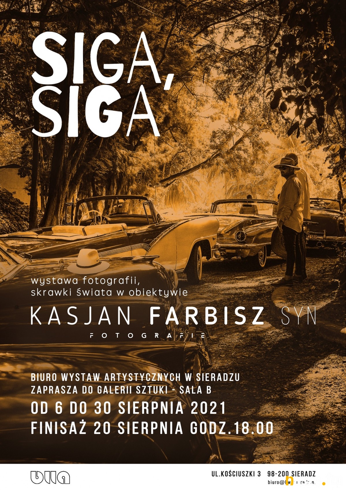Kasjan Farbisz syn – z urodzenia sieradzanin, z wyboru koninianin, najlepiej czuje się w fotografii krajobrazu, architektury i stylistyce surowego reportażu. Mówi o sobie lokalny patriota i potwierdza to jego artystyczny dorobek, bo choć wiele podróżuje i fotografuje na całym świecie, wciąż z upodobaniem poszukuje nieoczywistych kadrów w Koninie. Laureat między innymi I miejsca w IV Edycji Konkursu Fotograficznego o Nagrodę Marszałka Województwa Wielkopolskiego (w Kategorii Zabytkowe Obiekty). W ramach międzynarodowego konkursu 35awards - International Photography Awards, w kategorii Bird’s eye view of people, otrzymał wyróżnienie, uzyskując miejsce wśród 50 najlepszych fotografów z całego świata (spośród 1233 zgłoszeń, jako jeden z zaledwie trzech reprezentantów Polski). Na wystawie Siga, siga… udostępnione zostaną fotografie z podróży artysty, między innymi na Maderę, Sycylię, Wyspy Kanaryjskie, Kubę, do Zjednoczonych Emiratów Arabskich, Omanu czy Szkocji.