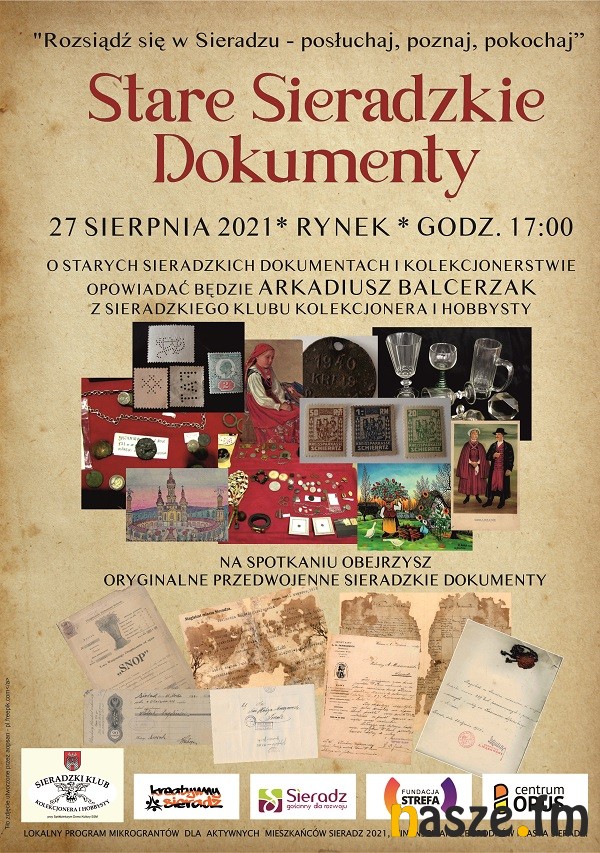 Na wydarzenie "Stare Sieradzkie Dokumenty" zapraszają Stowarzyszenie Kreatywny Sieradz oraz Sieradzki Klub Kolekcjonera. Jest organizowane w ramach projektu "Rozsiądź się w Sieradzu - posłuchaj, poznaj, pokochaj", realizowanego w ramach Lokalnego Programu Mikrograntów dla Aktywnych Mieszkańców Sieradz 2021 finansowany ze środków Miasta Sieradza.